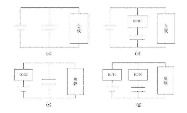 与超级电容配合使用的DCDC,在整车电源中的位置如下图所示,它可能出现在图(b)、(c)、(d)中所示位置上,而(b)是应用较多的一种形式。