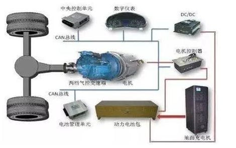 给车载电气供电,DCDC在电动汽车电气系统中的位置,如下图所示。它的电能来自于动力电池包,去处是给车载用电器供电。